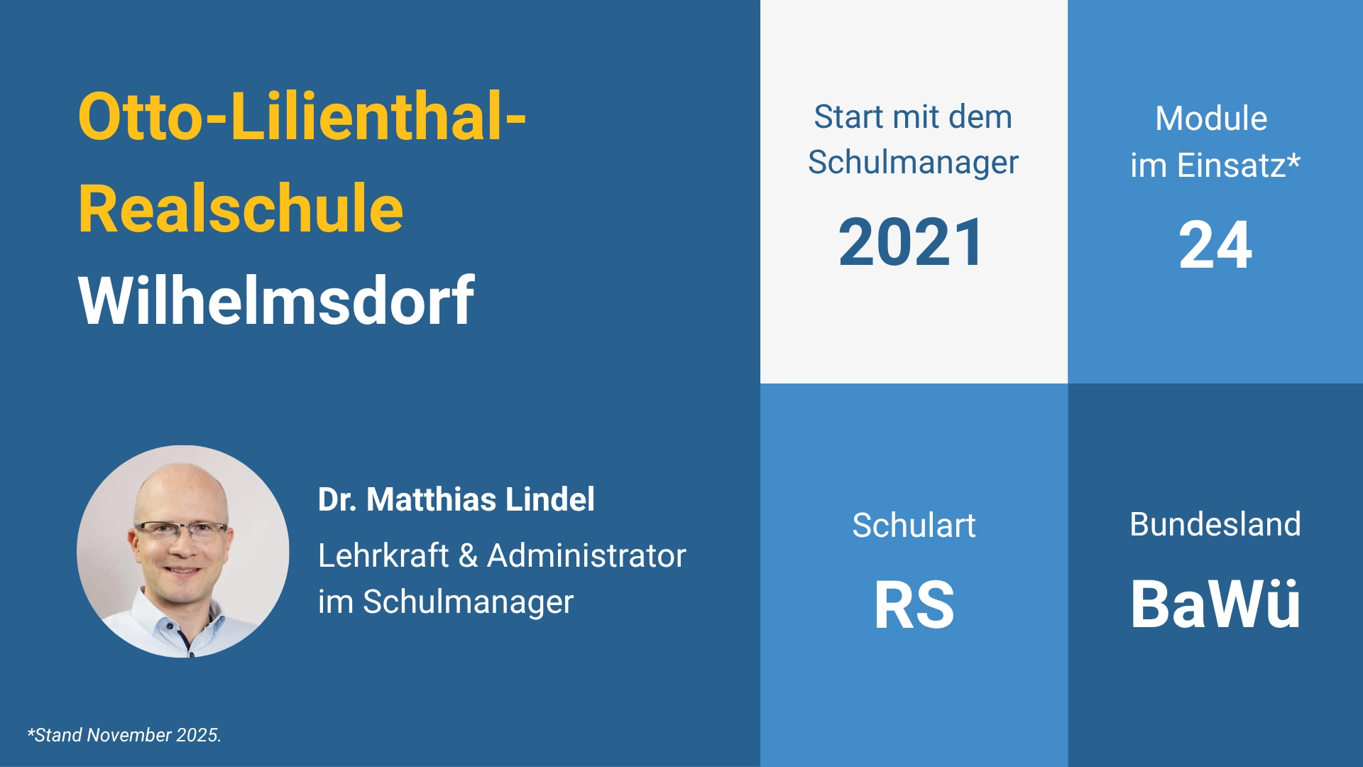 Die Otto-Lilienthal-Realschule Wilhelmsdorf hat den Schulmanager bereits seit mehr als vier Jahren erfolgreich im Einsatz. Im Gespräch berichtet Dr. Matthias Lindel, Lehrkraft und Administrator für den Schulmanager, wie sich der Schulalltag verändert hat und welche Ratschläge er für Schulen hat, die überlegen, eine Software zur digitalen Schulorganisation einzuführen.
